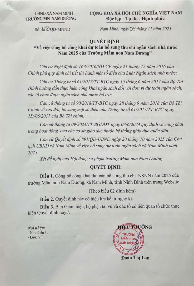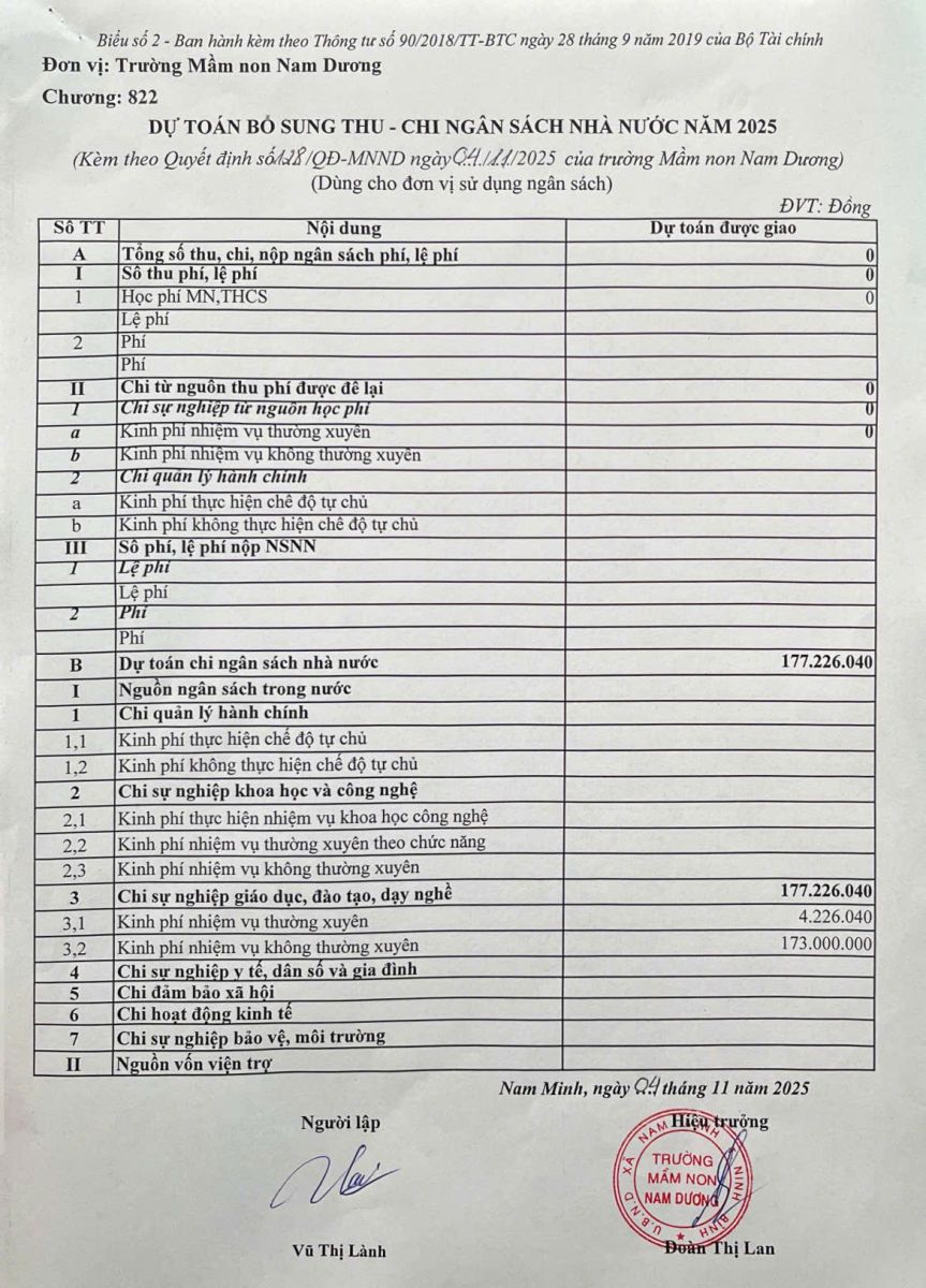 Công bố công khai dự toán bố sung thu chi NSNN năm 2025 của trường mầm non Nam Dương