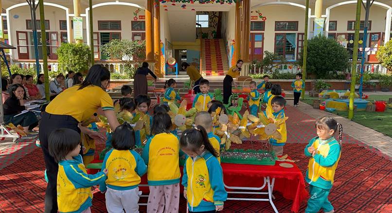 Hoạt động được tổ chức sáng tạo, thu hút sự tham gia tích cực của trẻ. Trẻ hứng thú khi được khám phá các nguyên vật liệu tự nhiên, biết quan sát, lựa chọn và phối hợp lá cây – cành cây khô để tạo nên những bông hoa đẹp mắt, mang tính thẩm mỹ và thể hiện ý tưởng cá nhân.