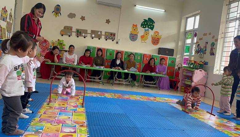 Hoạt động được tổ chức sôi nổi, phù hợp với lứa tuổi của trẻ. Trẻ được khởi động nhẹ nhàng theo nhạc, trẻ được thực hiệnvận động bò chui qua cổng đúng yêu cầu, rèn sự khéo léo và phát triển cơ tay, cơ chân. Trò chơi vận động giúp trẻ phản xạ nhanh, trẻhứng thú khitham gia và tăng tinh thần đoàn kết. Qua hoạt động, trẻ được rèn luyện thể lực, phát triển vận động toàn diện và tham gia học tập một cách vui vẻ, tích cực.